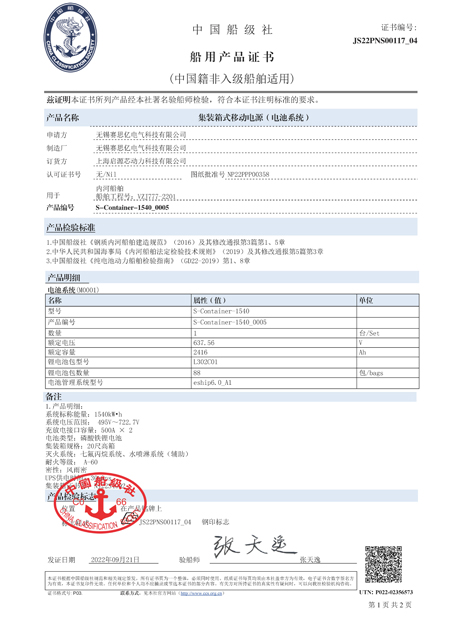 電池包、箱式電源及電池管理系統(BMS)獲中國船級社型式認可。
